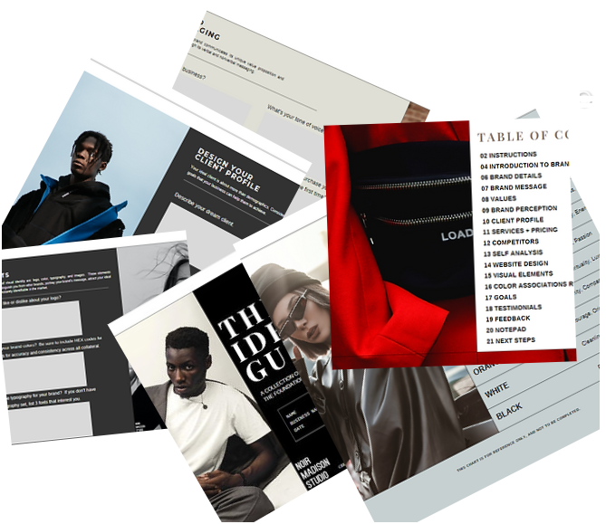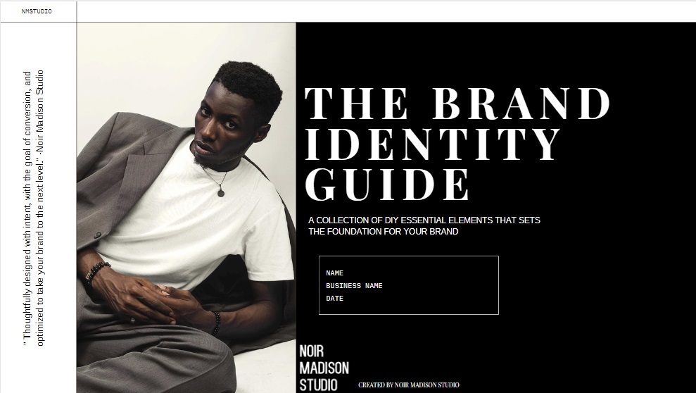 The Brand Identity Guide template, designed by Noir Madison Studio, is a collection of done-for-you essential elements that is solution-driven, in order to set the foundation, and functions as a brand manual to solidify the internal and external comprehension of your brand. Think of it as the foundation before building the house. This step comes before building your website or even creating marketing material.